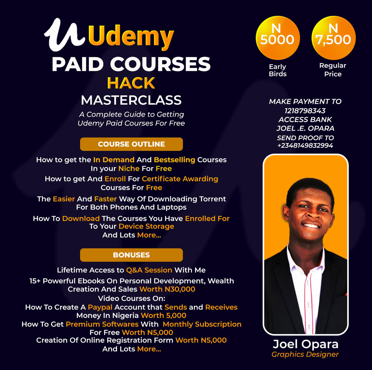 To gain access to this program, I can easily charge you 20k or even 50k...But I wouldn't charge you anything close to that.For a ONE time payment of N5000...You can now jump into this masterclass....and SAVE YOURSELF A LOT OF MONEY YOU SPEND ON COURSESprice moves up to N7500 very soonIf you want to pay now you will get it at N2999